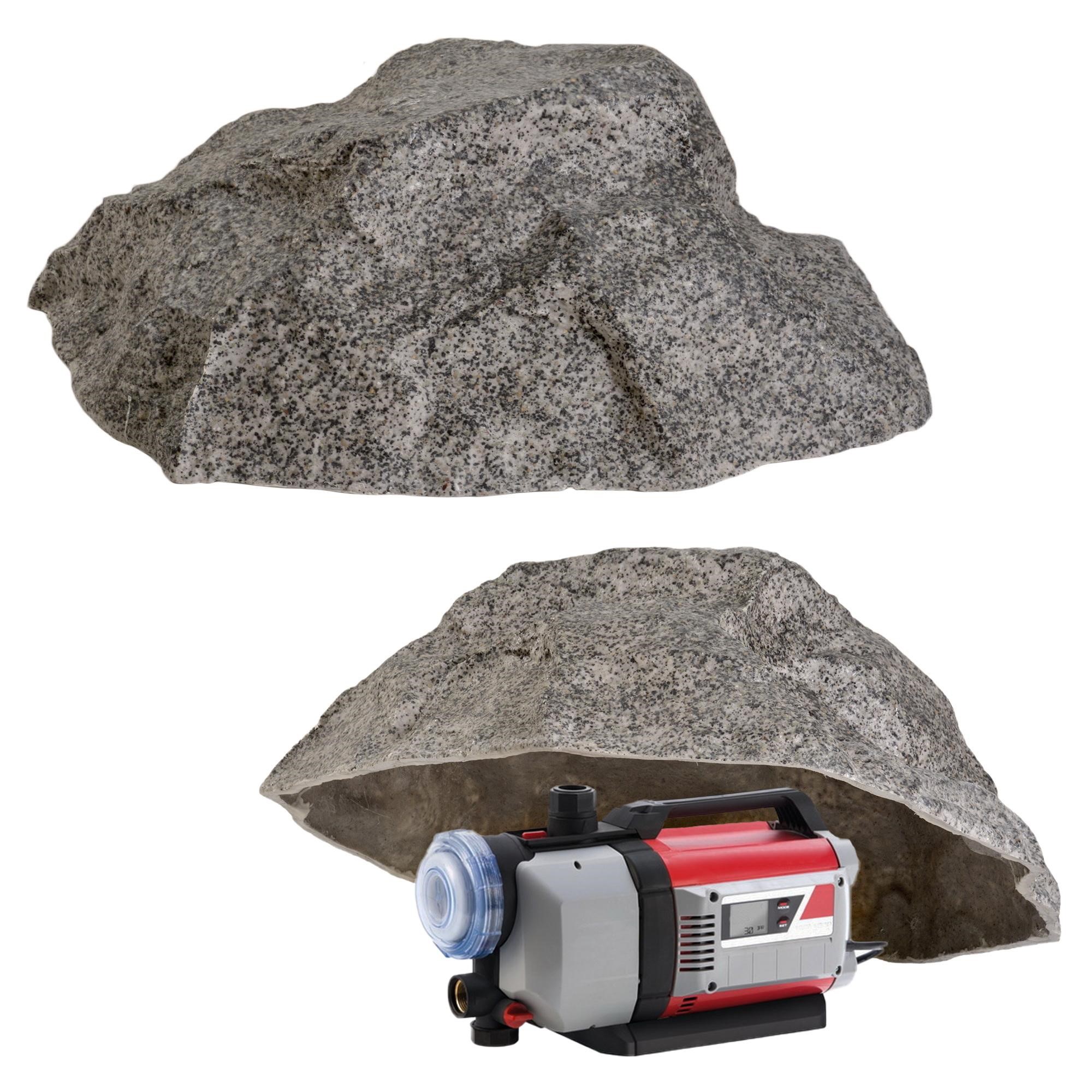 Traditional solutions fall short. Natural stone is visually ideal but weighs 250–400 kg, requires crane delivery, cannot be hollowed to shelter equipment, and costs €1,000–5,000+. Budget plastic covers are lightweight but their painted surfaces fade, crack, and chalk within two to three outdoor seasons — leaving the garden looking worse than before.