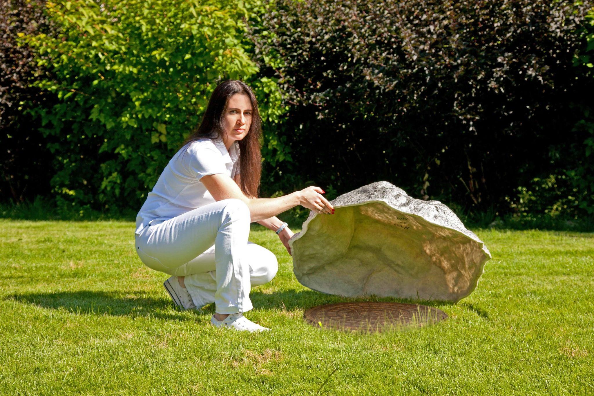 Installation is immediate. Place the stone directly over the target object on any surface: grass, soil, gravel, paving. No anchoring, no foundation, no tools. Total setup time: <2 minutes. To access the equipment underneath, lift the stone. At 11.50 kg, the M-02 can be handled by one person, though two people make placement easier.