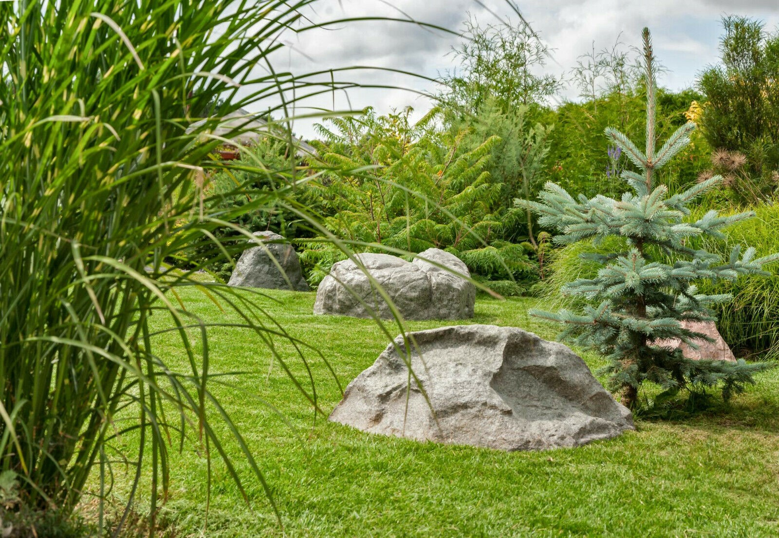 GARTENDEK M-02 is a hollow artificial stone designed for buyers who need ø 73 cm equipment coverage in the most compact possible body. Shaped to resemble a low, wide natural fieldstone, it conceals large ground-level utility elements — pool pump systems, septic lids, manhole covers, transformer boxes — while adding a calm, natural boulder accent to the landscape.