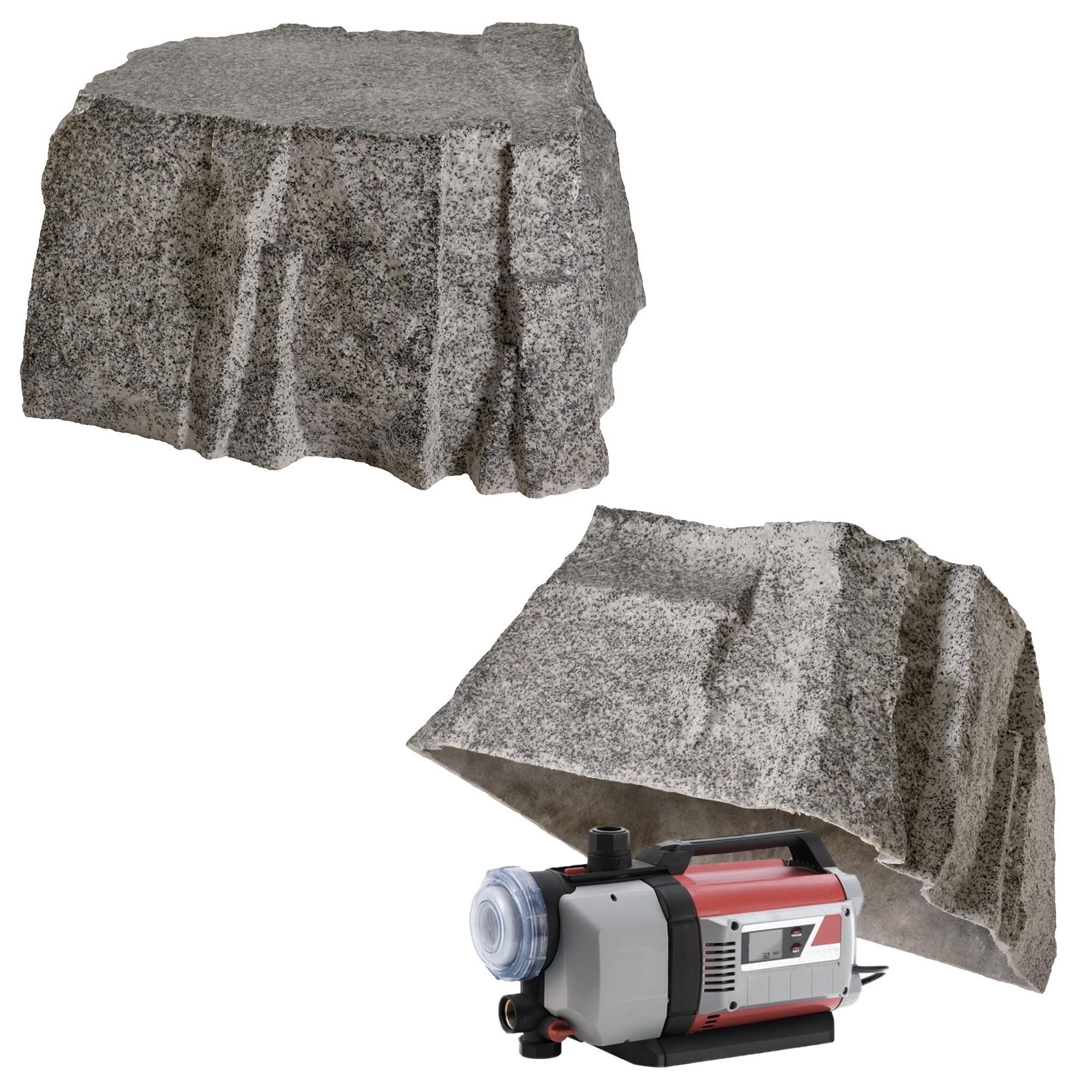 Cover a well casing with above-ground riser (standard EU ø 125–160 mm casings fit with clearance), conceal a vertical pressure tank / membrane expansion vessel (ø 35–50 cm), hide a backflow preventer assembly on a vertical irrigation riser (35–42 cm height), cover a tall standpipe or garden tap on a high riser (30–40 cm). Also suitable for an upright sump pump discharge column, gas meter riser, tall pond filter or UV clarifier, or tall electrical distribution box.