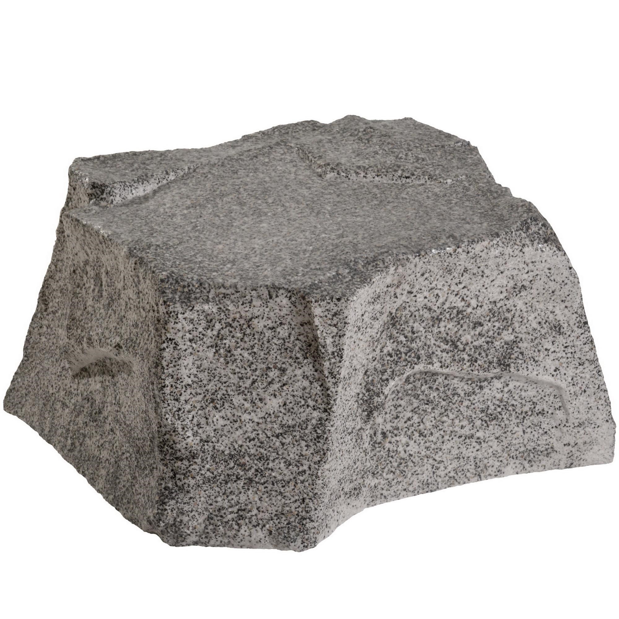 The surface is formed from real marble chips and marble powder embedded in an ISO/NPG gelcoat — not painted. The texture and color variation mimic a natural angular granite boulder. At normal viewing distance (1 m+), the M-04 is not identifiable as artificial. Handcrafted production ensures unique natural color variation on each stone.