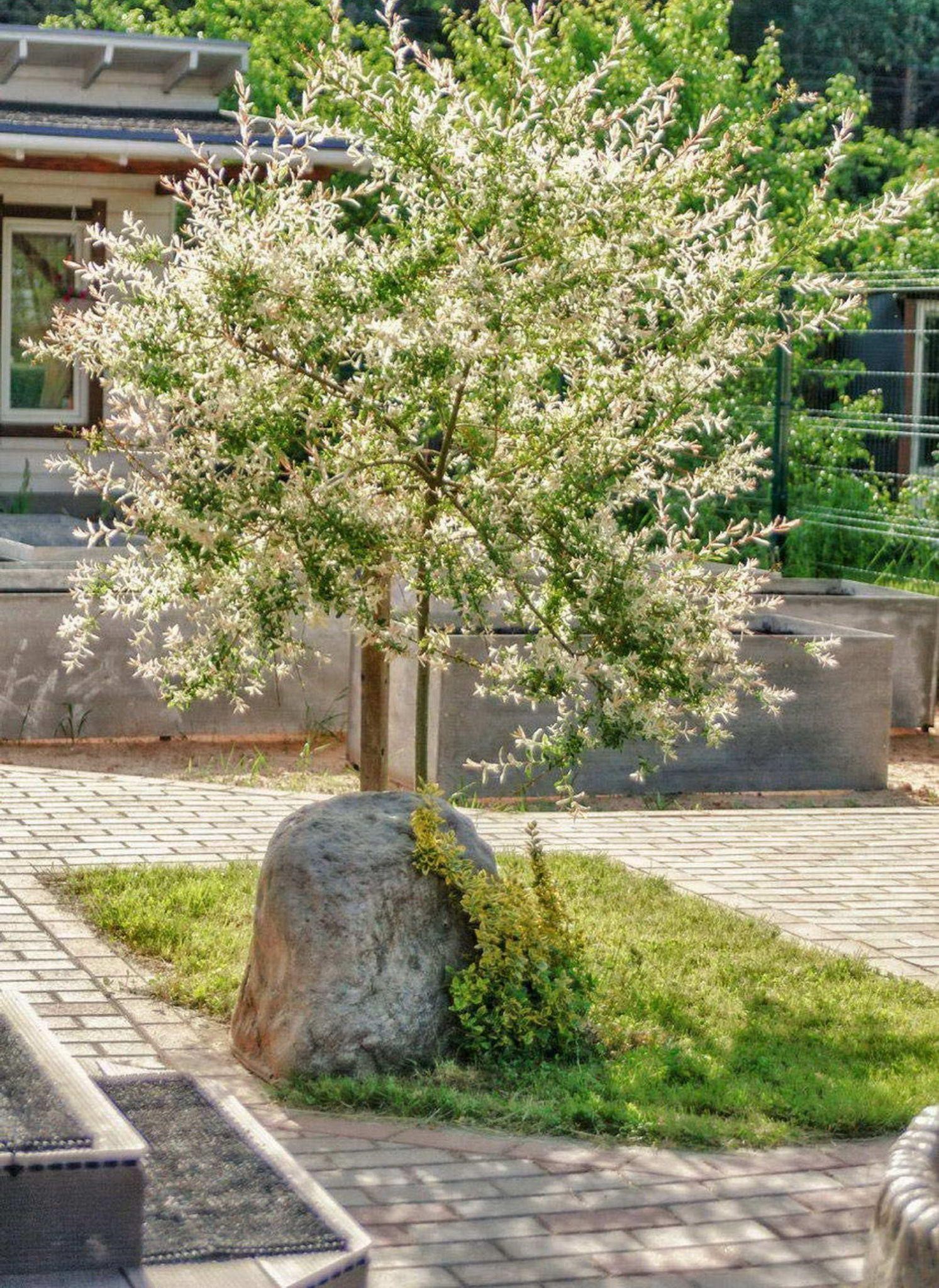 Transformer housings, tall irrigation valve assemblies, backflow preventers, and cable junction boxes near a terrace are replaced by a calm, natural boulder form.