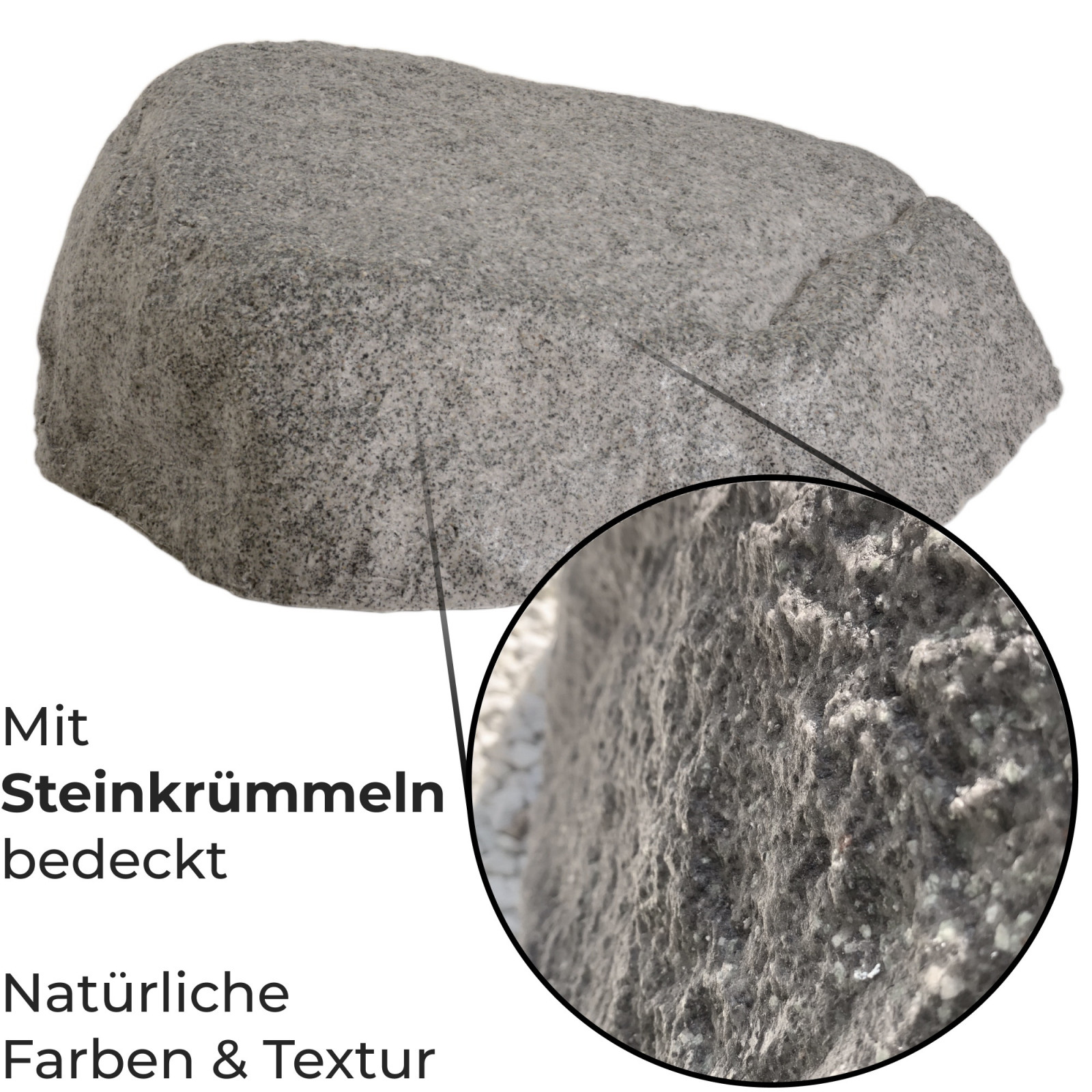 A convincing large round field stone accent for lawns, pond edges, and focal planting beds.