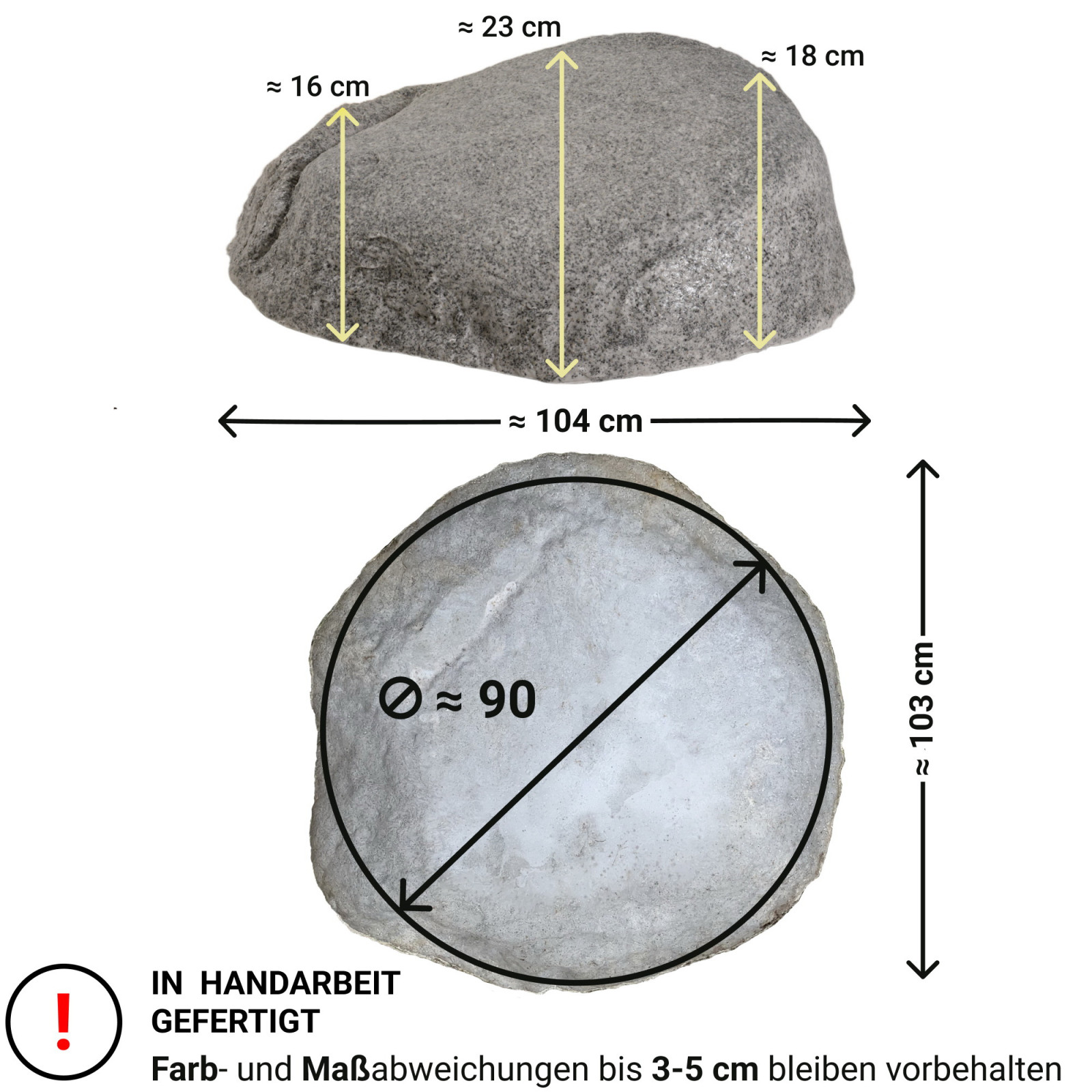 The product is handcrafted (In Handarbeit gefertigt) — color and dimensional deviations of 3–5 cm are within normal range and contribute to the natural stone appearance.